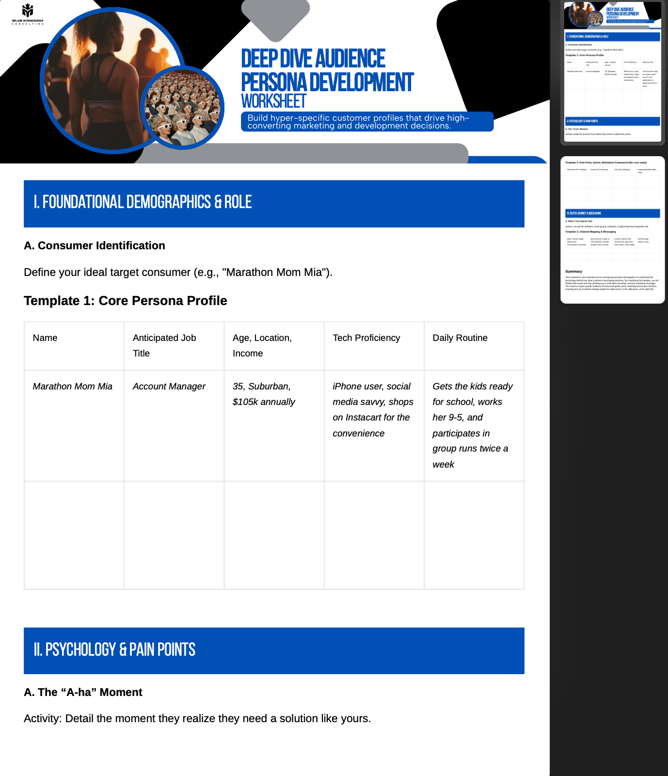 Develop hyper-specific personas that write your sales copy for you. Your audience isn't just a demographic - they are individuals with deep-seated fears, specific motivations, and pressing pain points. This worksheet help you stop selling features and start selling the transformation your customer craves.