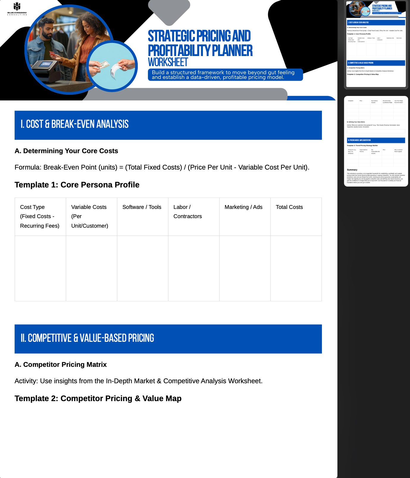 Pricing is the single biggest lever for profitability, yet most entrepreneurs simply copy their competitors. This worksheet is a step-by-step blueprint to optimize value and margins; giving you the tools to calculate your value, cover costs, and select a pricing model that scales with your business.