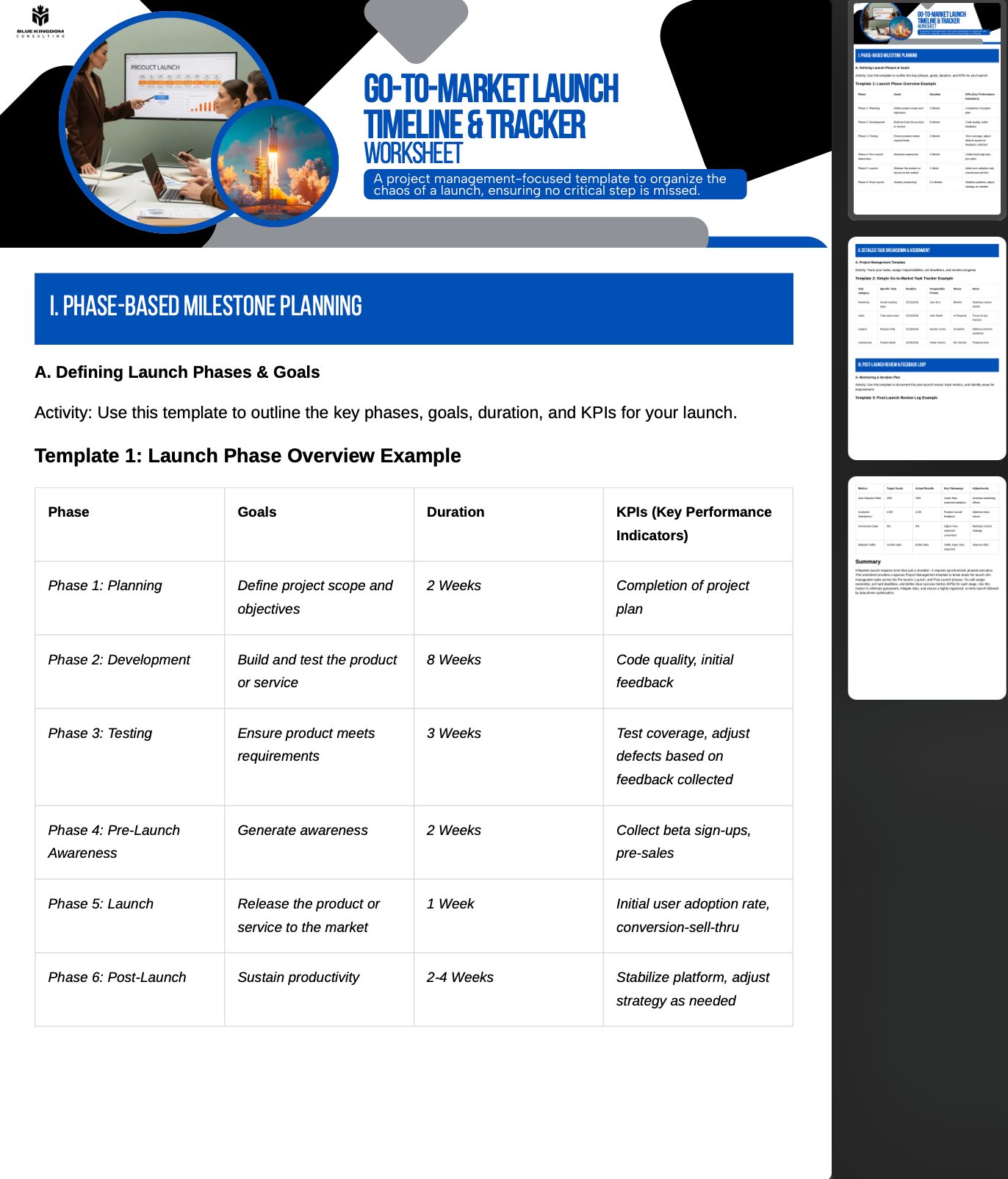 A successful launch isn't magic; it's meticulous organization. This worksheet transforms the overwhelming "to-do list" of a GTM strategy into crystal-clear, phased execution plan. It ensures marketing, development, and sales are perfectly synchronized, avoiding last-minute panics and missed opportunities.